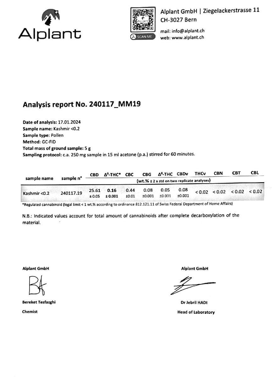 Kashmir 25% CBD Hash, er en potent og fuldspektret kvalitets-hash som vi har importeret fra Schweiz. I Schweiz har man i mange år haft bedre lovmæssige rammer for at kunne dyrke og udvikle lovlige cannabisprodukter, hvilket har gjort dem til nogen af de førende producenter af cannabis i Europa! Aromaen beskrives som indbydende, dejlig og meget genkendelig. Konsistensen beskrives som blød, men fast, lækker og en anelse klistret, men kan stadig håndteres.